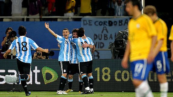 Los jugadores de Argentina felicitan a su compañero Lionel Messi autor del gol del triunfo frente a Brasil en tiempo de descuento